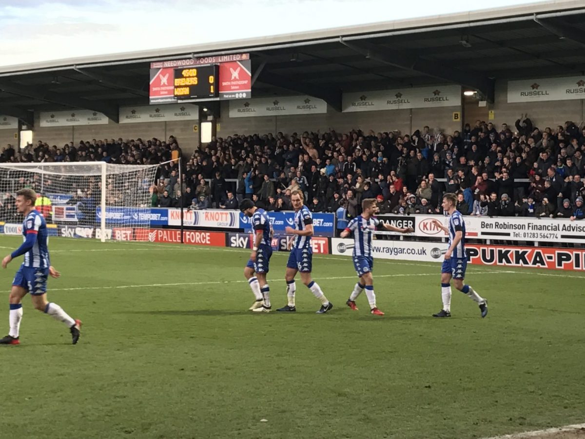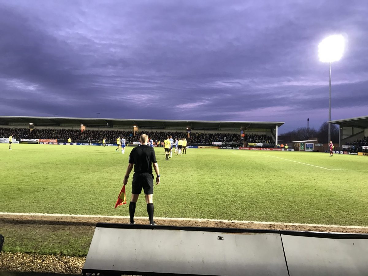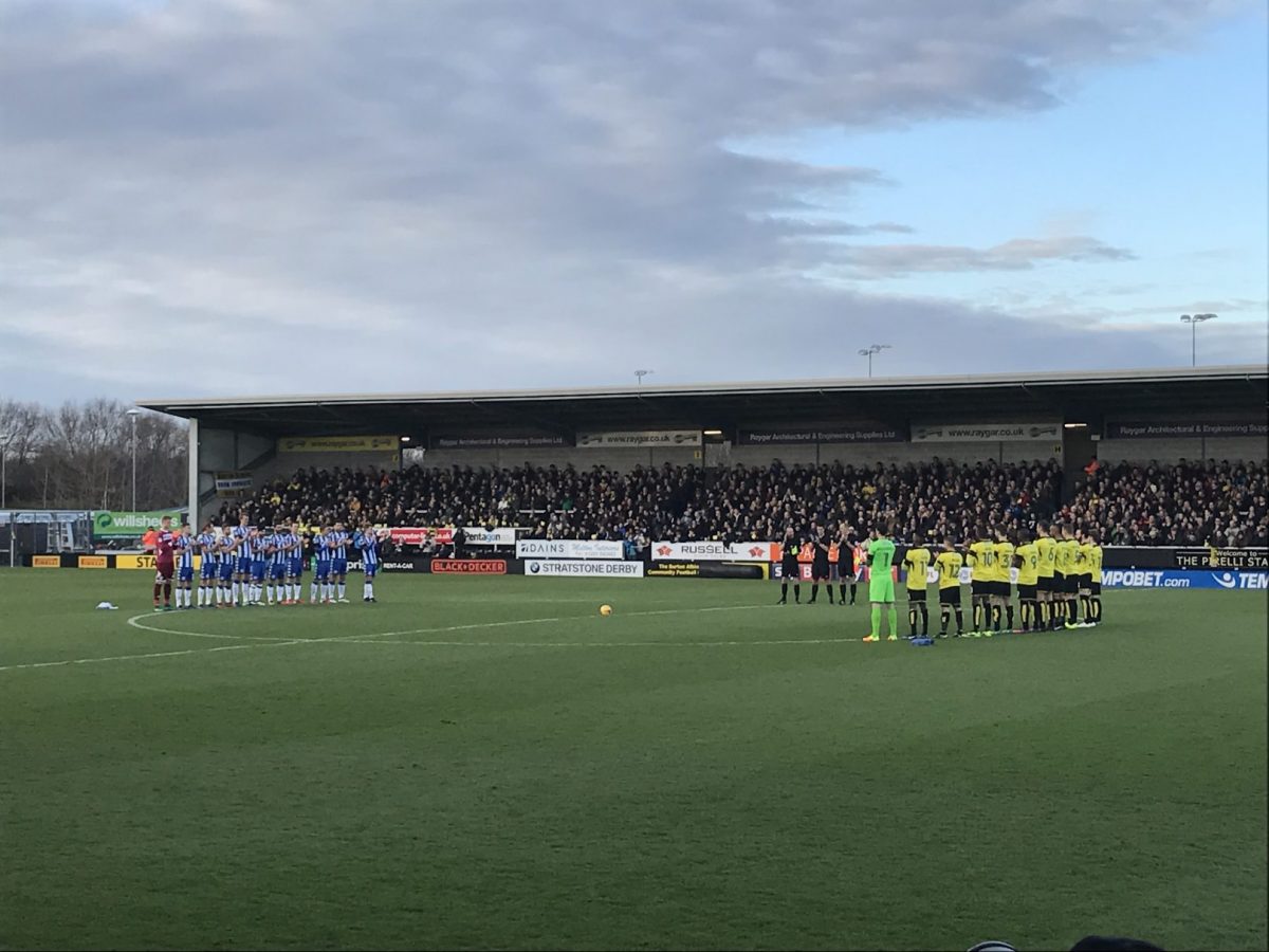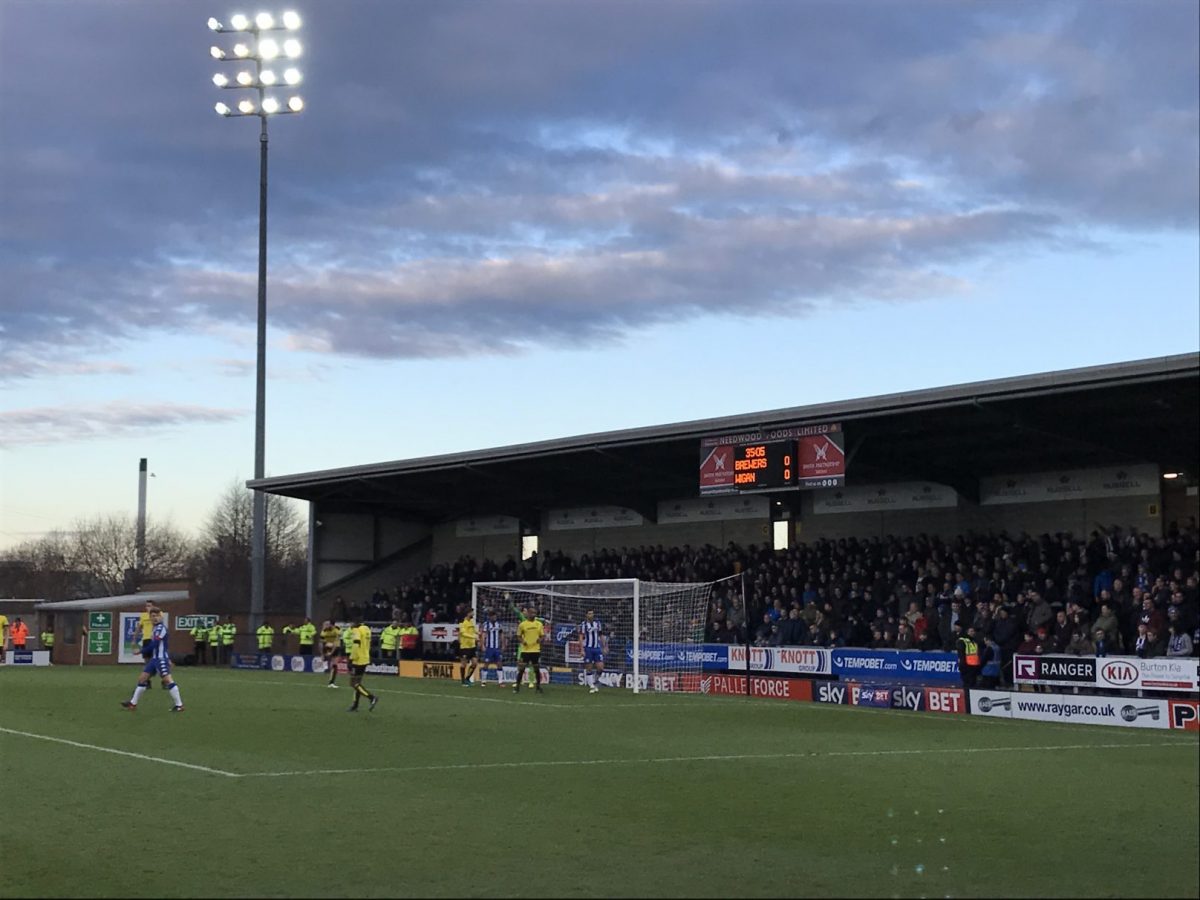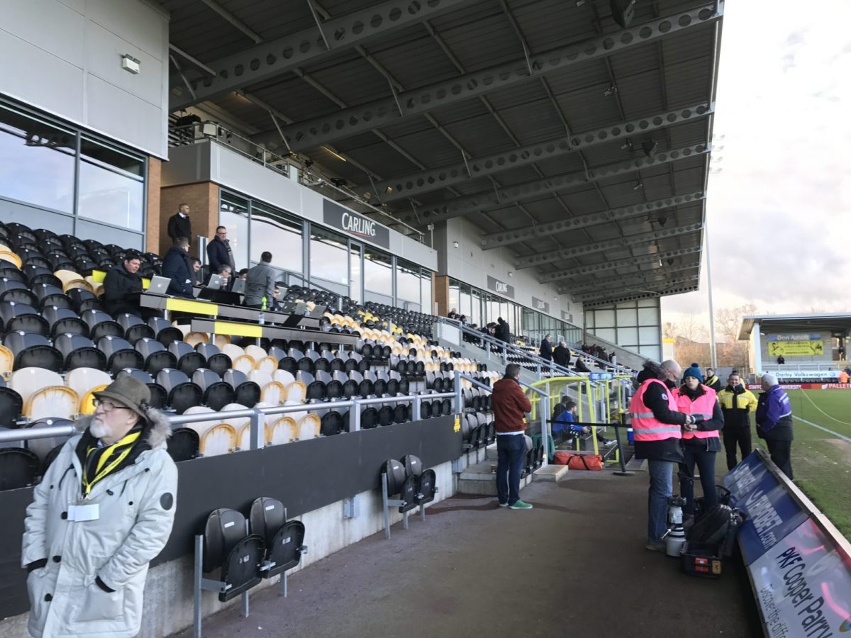 Das Spiel der beiden Aufsteiger fand im Pirelli-Stadion von Burton-upon-Trent statt. Wenn man den Stadionnamen hört, erwartet man zunächst eine absolut wahnsinnige Multifunktionsarena. Die war es zum Glück aber nicht. Bei dem Stadion handelt es sich um ein sehr kleines und enges, aber auch typisch englisches, Stadion mit einem Fassungsvermögen von 6.912 Zuschauern. Getreu dem Motto, klein aber fein. Der Stadionname stammt übrigens wirklich vom originalen italienischen Reifenhersteller, welcher in Burton seinen englischen Hauptsitz hat und den Club angeblich mit ein paar Pfund unterstützt.