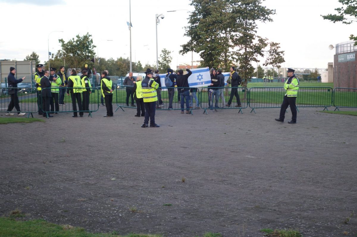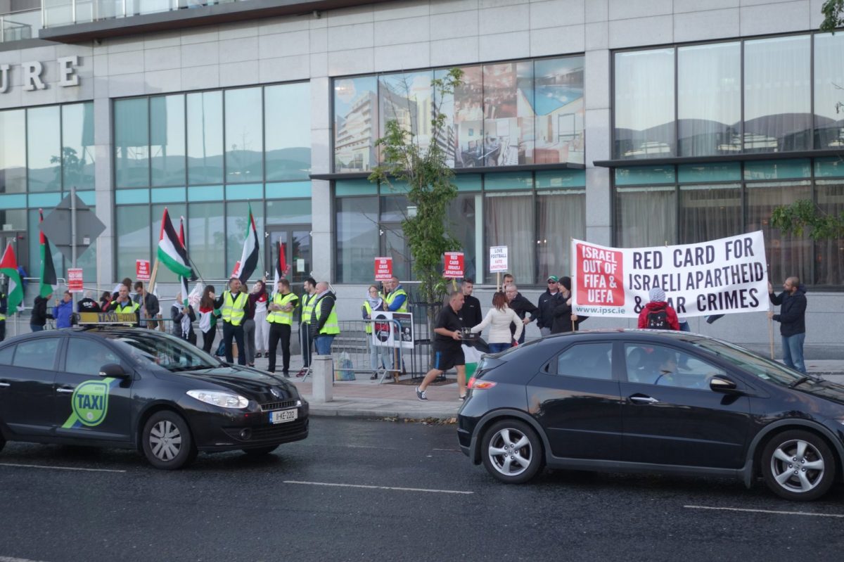 Zum Tallaght-Stadium im Südwesten Dublin startete ich recht frühzeitig, ca. 2 Stunden vor Spielbeginn. Dies war auch dringend notwendig, da die Straßenbahn LUAS (rote Linie) stark frequentiert war und gute 40 Minuten Fahrtzeit zum Stadtteil Tallaght benötigte. Nach Ankunft an der Endstation war es nur ein kurzer Fußweg zum Stadion. Dieser führte letztlich nur über den Parkplatz eines Supermarktes bzw. über ein Tankstellengelände. Da war es also, das UEFA 4-Sterne-Stadion. Mein erster spontaner Gedanke war, dass die UEFA schnellstens nach Wattenscheid kommen sollte, um den 4. Stern an die Tribüne zu heften. Für einen geordneten zweiten Gedanken war gar keine Zeit, da ich plötzlich inmitten einer politischen Demonstration stand. Auf der einen Straßenseite standen ca. 7 israelische Fans aus Tel Aviv, auf der anderen Straßenseite befanden sich ca. 15 Demonstranten mit palästinensischen Flaggen. Dazwischen eine ca. 30köpfige Gruppe der irischen Polizei „Garda“. Es ging um das Übliche, die bösen Israelis, die lieben Palästinenser, oder war es anders herum? Ich bin jedenfalls kein Freund von Politik bei Sportveranstaltungen und begab mich zum Haupteingang des Grounds.