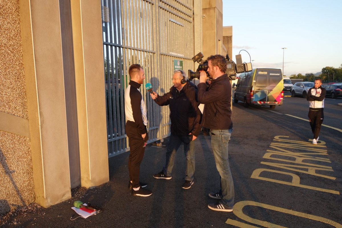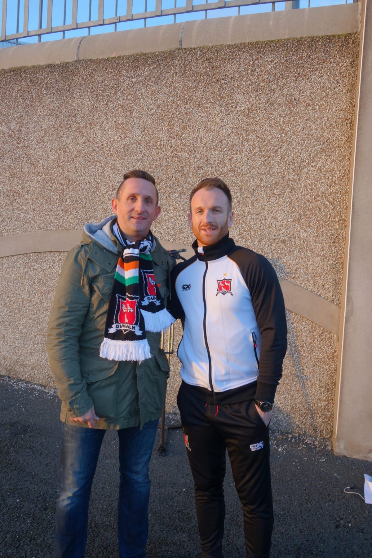 Aber es wurde noch besser. Bei all den Spielen außerhalb der glamourösen Stadien ist es immer verdächtig, wenn ein junger, mir unbekannter, Mensch im Trainingsanzug vor dem Stadion Fernsehinterviews gibt. Diesmal handelte es sich um den gesperrten Kapitän des Dundalk FC, Stephen O´Donnell. Der 30jährige ehemalige Jugendspieler des Arsenal FC war ein richtig netter Kerl, nahm sich Zeit und zeigte sich am deutschen Fussball sehr interessiert.
