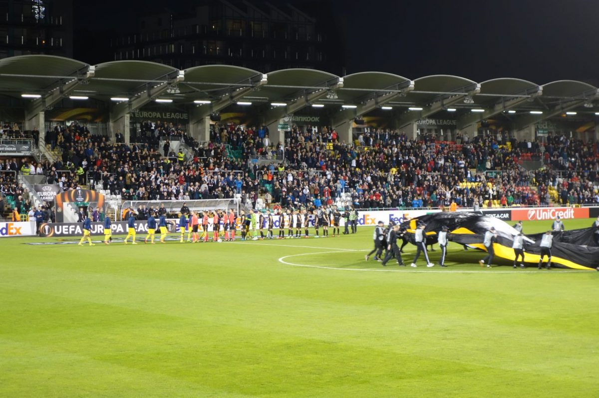 Doch bereits in der 2. Runde gegen BATE mussten sich die Verantwortlichen des Dundalk FC etwas einfallen lassen. Das eigene Stadion war zu klein und nicht mehr freigegeben, das Aviva-Stadium in der Hauptstadt Dublin zu teuer und viel zu groß. Was nun? Genau, man zieht zwar in die Hauptstadt, nimmt aber einfach das Stadion eines Konkurrenten um die Meisterschaft. Das Tallaght-Stadium der Shamrock Rovers mit einem Fassungsvermögen von knapp 6.000 Zuschauen ist das drittgrößte Stadion des Landes und wurde von der UEFA als 4-Sterne-Stadion klassifiziert. Dies wurde nach dem überraschenden Sieg gegen BATE Borisov aufgrund des nationalen Ereignisses aber auch zu klein. Man entschloß sich für das Spiel der Spiele gegen Legia Warschau zu einer Anmietung des teuren Aviva-Stadiums. Da es nach der Niederlage statt der Champions-League nur die Europa-League wurde, ruderte man zurück und legte sich für alle Spiele in der Gruppenphase auf das Tallaght-Stadium fest. Für die anstehenden „Reisen“ von Dundalk-Anhängern nach Dublin wurden eigens zwei Hashtags für die sozialen Medien erschaffen: #Bethere und #CmonTheTown !