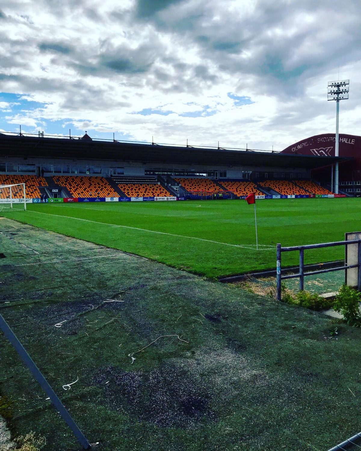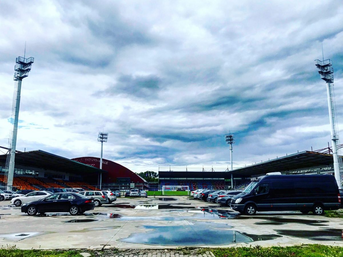 Nach der Ankunft am Innenstadt-Stadion des Riga Football Club, welches übrigens immer noch den Namen „Skonto-Stadion“ trägt, gab es die erste große Überraschung! Die im Südosten der Arena avisierte Stahlrohr-Tribüne wurde offensichtlich zur Vergrößerung des Parkplatzes einfach abgebaut. Damit wäre es theoretisch möglich gewesen, das Spiel ganz bequem aus dem Auto zu verfolgen! Hierfür wäre nur ein günstiger Parkschein erforderlich gewesen…also eine Art Autokino mit Stadionatmosphäre!