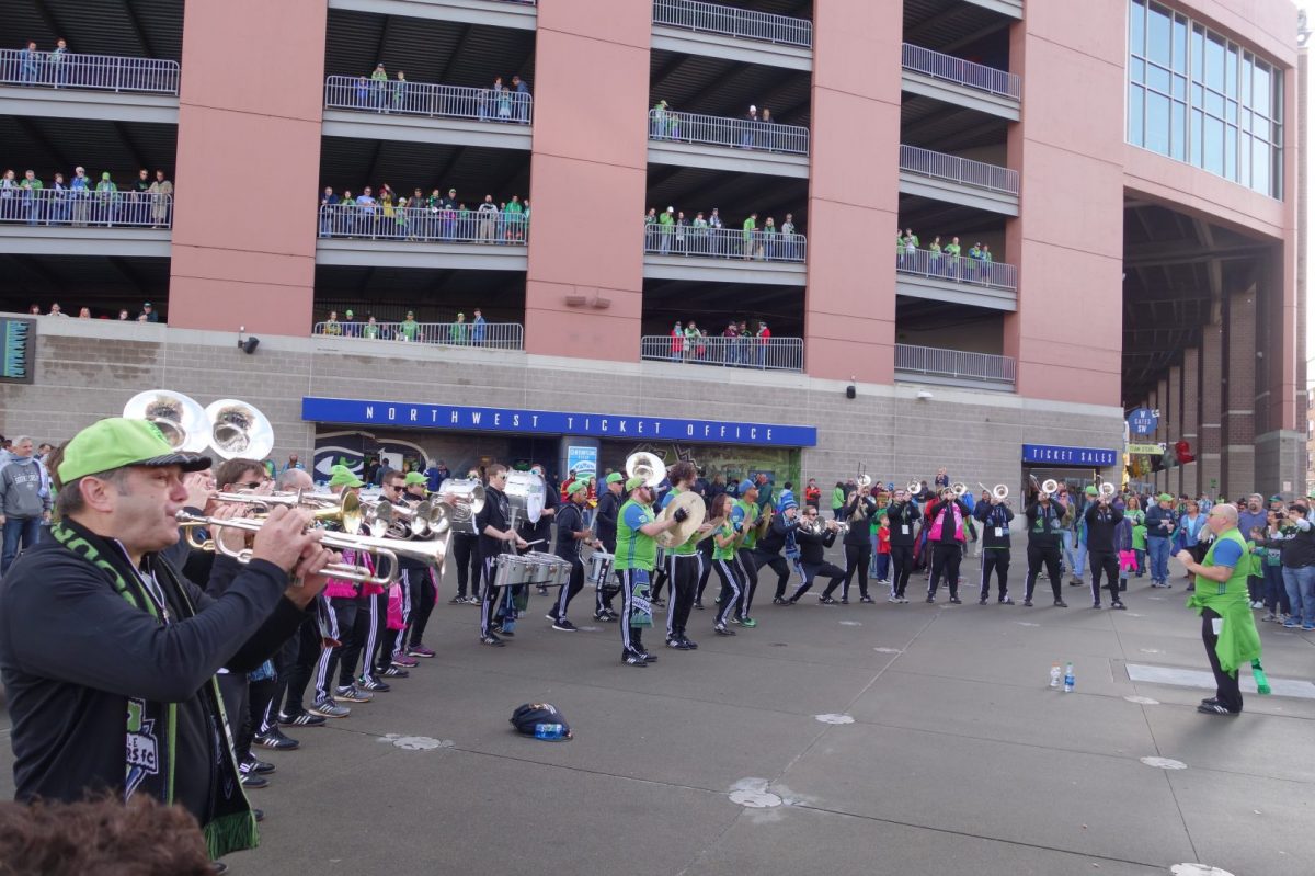Bei Ankunft am Stadion war die übliche MLS-Werbemaschinerie wie immer vor Ort. In Zeiten der Diskussionen um Fußballclubs von Getränkeherstellern dürfte dies keine ernsthafte Diskussion mehr wert sein. Wem es nicht gefällt, geht einfach weiter, wer Lust auf Gratis-T-Shirts etc. hat, macht mit. So einfach ist das. Absolute Weltkasse war in jedem Fall die anwesende Sounders-Big-Band, die vor dem Stadion bekannte Pop-Songs eindrucksvoll nachspielte.