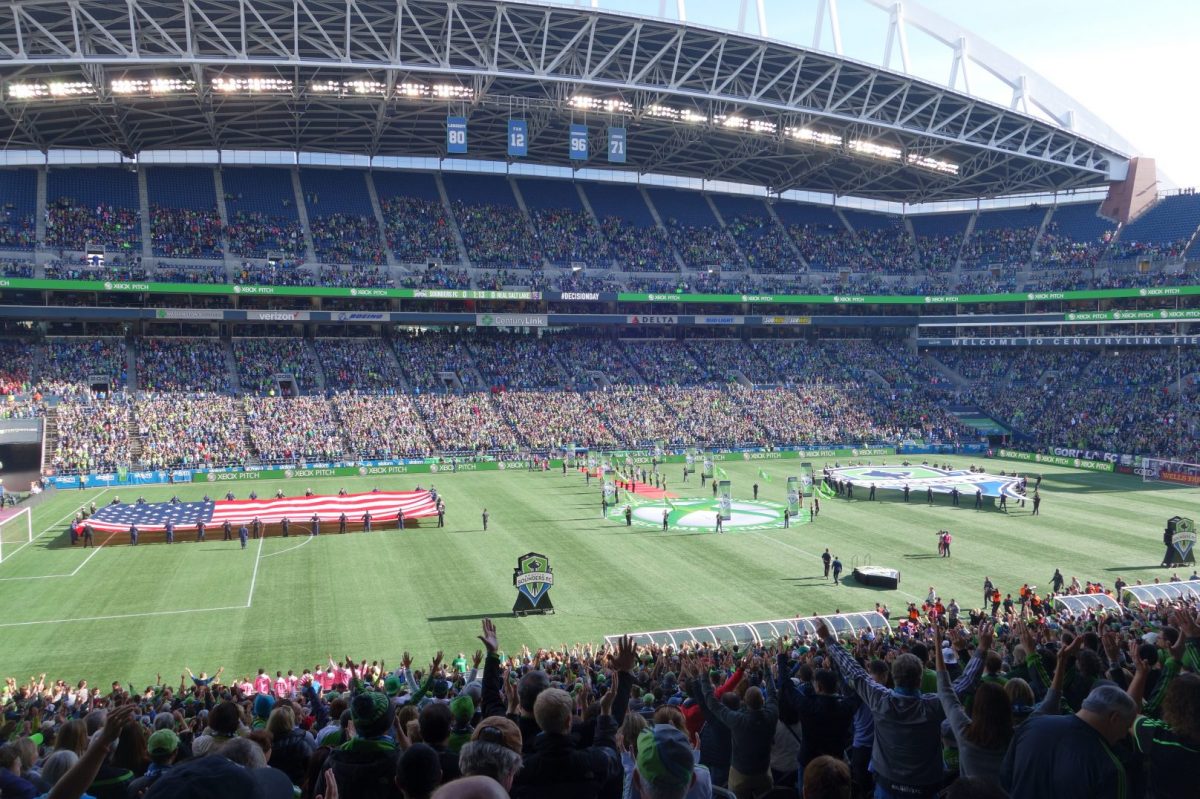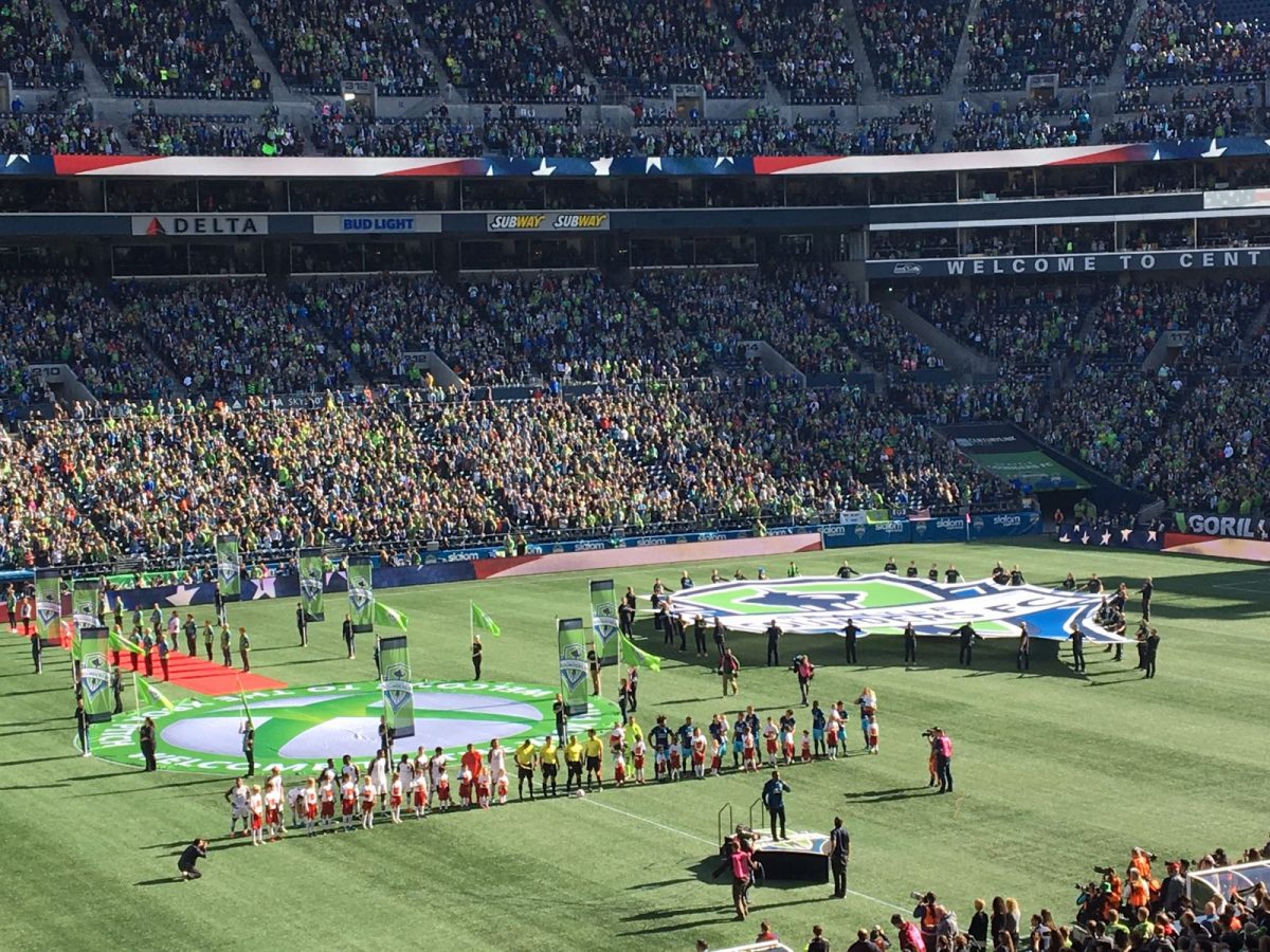 Nach Erreichen meines Platzes auf der Haupttribüne ging es auch schon los. Anhand der Aufbauten auf dem Platz (überdimensionale USA- und Sounders-Flaggen, mehrere Podeste, Feuerwerk, „Feuer“-Fontänen) fühlte ich mich zunächst wie beim Champions-League-Endspiel. Dies verstärkte sich dann beim Einlauf der Mannschaften, als alle Zuschauer das von der isländischen Nationalmannschaft bekannte Klatschen imitierten. Auch Dank der stimmungsvollen Sounders-Ultra-Gruppierung „Gorilla FC“ herrschte eine europäische Stimmung. Die endete kurzfristig mit Beginn der live-gesungenen Nationalhymne im Kanon. Auch hier konnte ich einfach nur genießen, ein absolutes Erlebnis und wirklich fantastisch. Dies gibt einem eine gewisse Vorfreude auf das Spiel und suggeriert vielleicht auch, in der Folge etwas ganz Besonderes zu sehen.