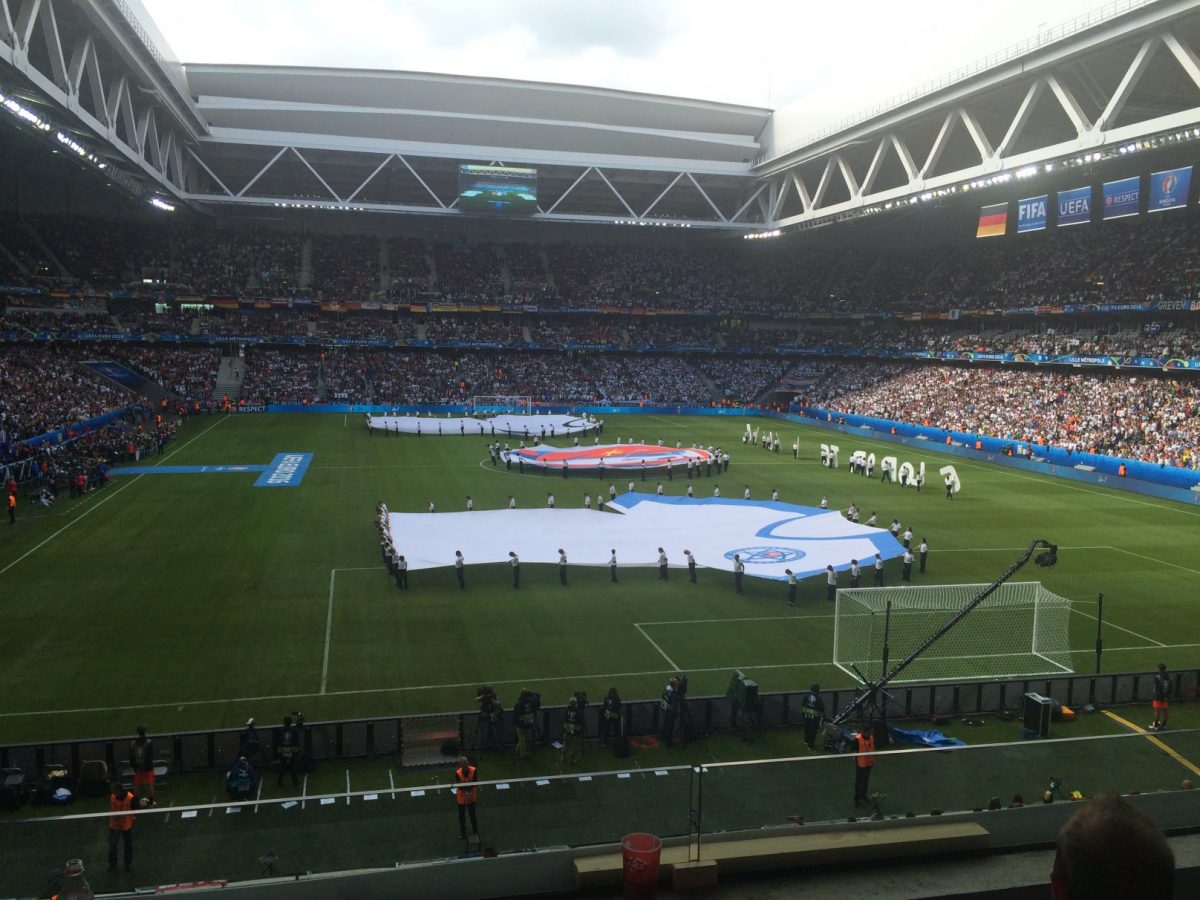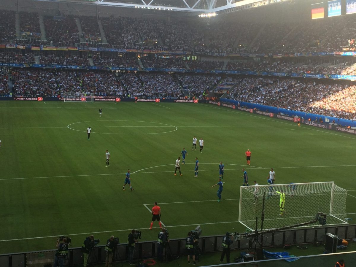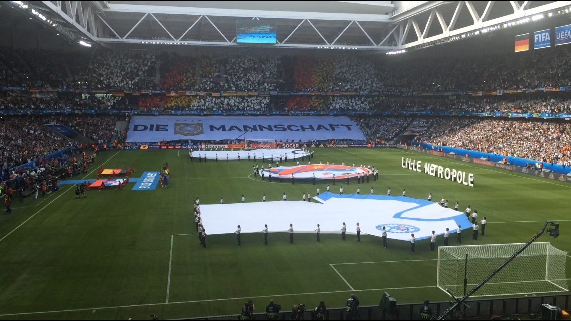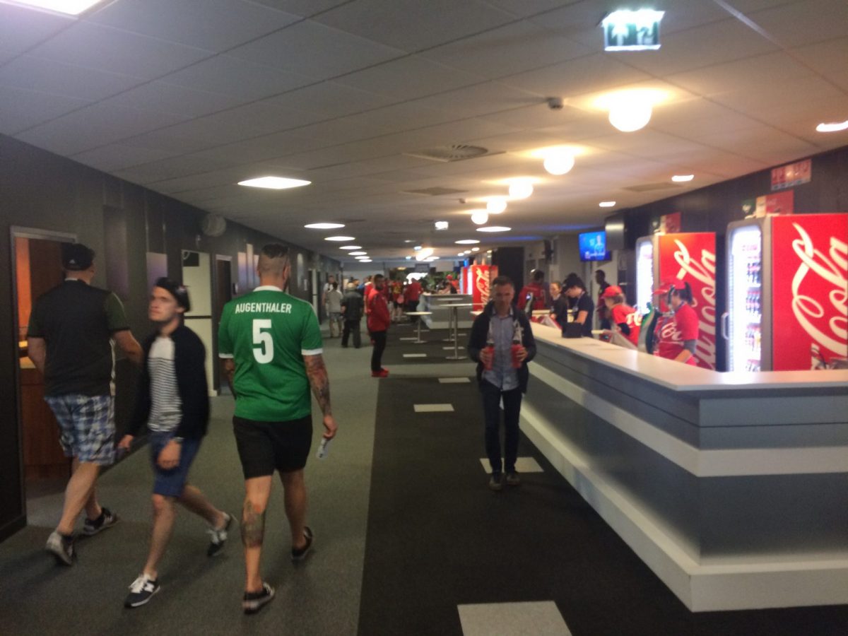 Nach nochmaliger Ankunft am Stade Pierre Mauroy ging es nach dem Verzehr eines Hamburgers zum „Selbstkostenpreis“ von 6 Euro und der Absolvierung von diversen Sicherheitskontrollen ins Stadioninnere. Trotz unserer reichlich vorhandenen Stadionerfahrung glich die Suche nach unseren Plätzen in der Folge einer Komödie. Es ging von einem Ordner zum nächsten Ordner, es ging vom Unterrang auf den Oberrang und zurück. Dies lag daran, dass uns von der UEFA trotz der eher „günstigen“ Preiskategorie 3 insgesamt vier Sitzplätze in einem nicht genutzten VIP-Bereich zugewiesen wurden. Der Bereich besaß natürlich einen separaten Eingang und war gar nicht so einfach zu finden. Zumindest nicht, wenn man etwas getrunken hat.