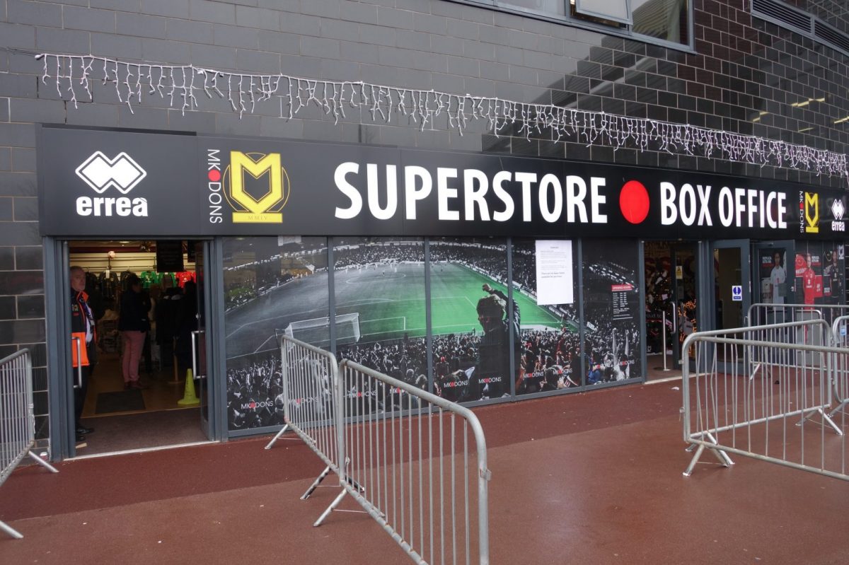 Der Vorort Blechtley war zumindest oberflächlich alles andere als schön. Im Verlauf des knapp 30minütigen Fußmarsches zum Stadion führte der teils unbefestigte Gehweg bei unangenehmen Dauerregen durch mehrere sehr düstere und verdreckte Unterführungen. Absolute Höhepunkte des Weges waren die Ruine eines abgebrannten Burger-King-Restaurants und ein wohl schon länger geschlossener Pub, der mit Holzlatten zugenagelt wurde. Die beschriebene Apokalypse endete aber völlig unvermittelt nach Erreichen des mk:stadiums. Der Ground befand sich nämlich inmitten einer Art Einkaufszentrum. Der übliche 24-Stunden-ASDA-Megasupermarkt, ein Sportgeschäft, ein Fitnessstudio und ein bekannter irischer Textildiscounter waren vor Ort.