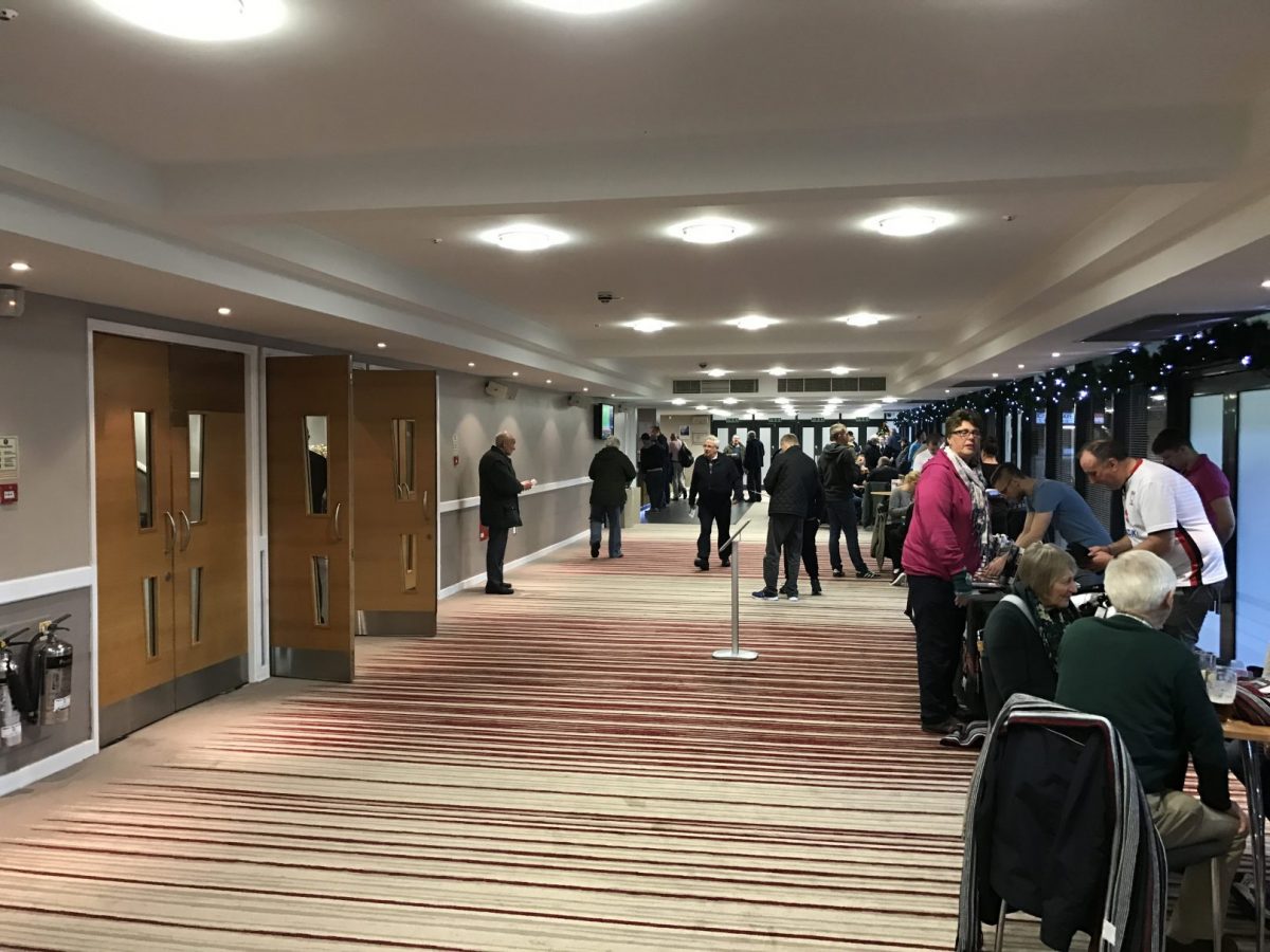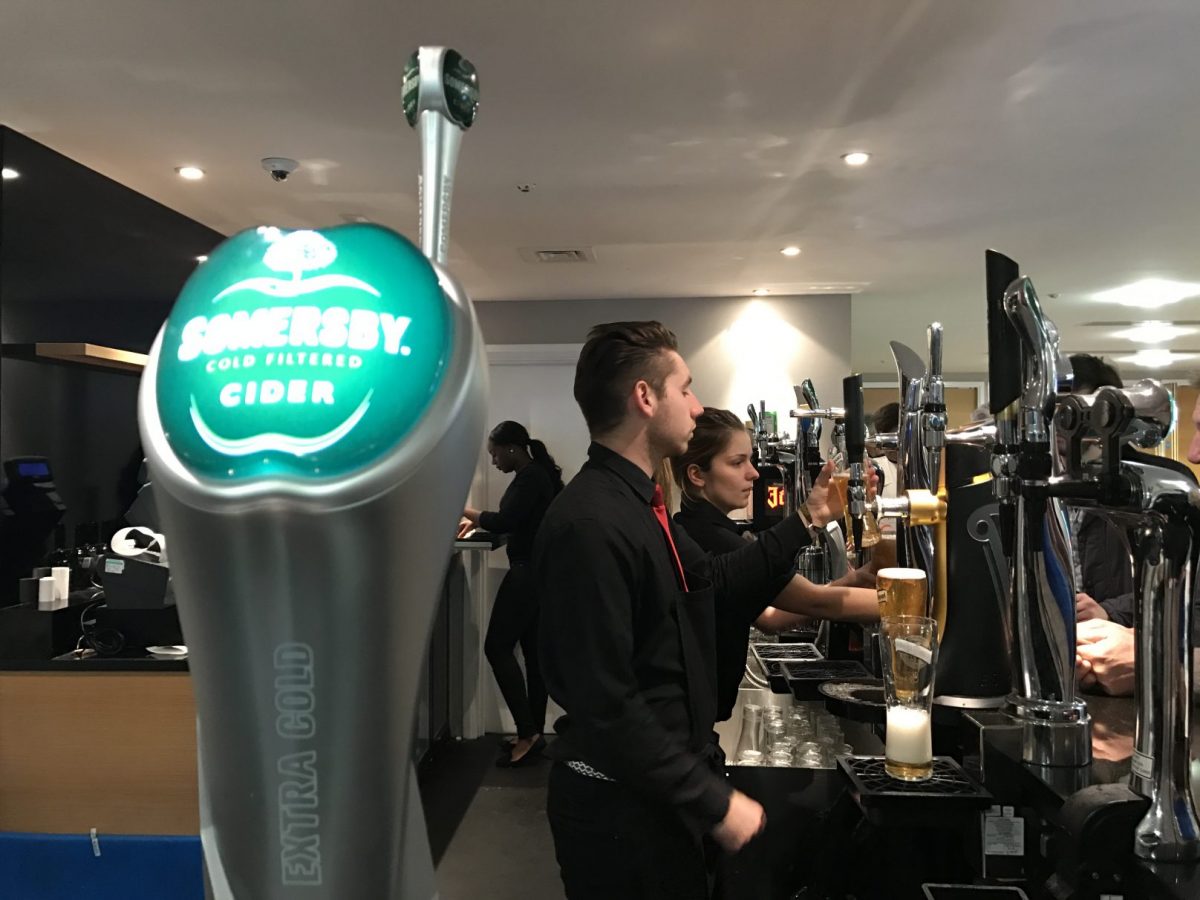 Nachdem ich meine Tickets an der Rezeption des Hilton-Hotels abholte, ging es in die erste Etage des Hotels, oder war es doch das Stadion? Dies wurde zunächst nicht ganz klar, da ich mich in einer Art VIP-Lounge befand. Da der Eintrittspreis in Höhe von 30 Pfund aber keine Freigetränke beinhaltete, musste ich mir einen leckeren Cider an einer der zwei Pub-Theken gegen Entgelt besorgen.