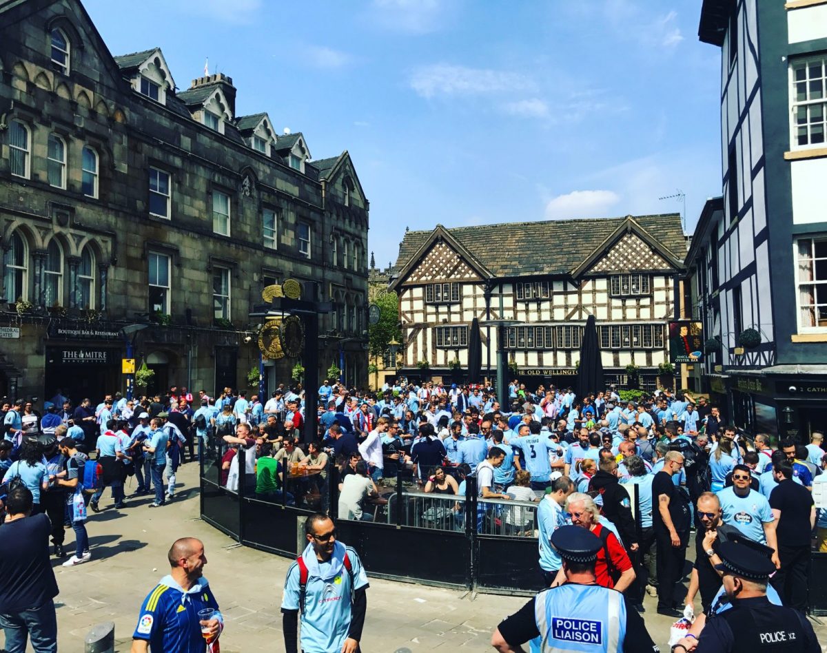 Nach einem kurzen Aufenthalt im Hotel ging es nachmittags zunächst einmal in das nahe gelegene Citycenter Manchesters. Die typisch englische Stadt mit ihrer Fußgängerzone, dem örtlichen Sports-Direct-Geschäft und vielen Geschäften im Einkaufscenter Arndale wirkt tagsüber sehr trubelig und multikulturell. Für die erste Europapokal-Stimmung ging es zum „Exchange Square“, wo bereits mehrere hundert Fans aus Spanien das englische Bier genossen. Schwerpunkt waren hier die altehrwürdigen Pubs „Sinclairs Oyster Bar“ und „The Old Wellington“, welche bei den Celta-Fans offensichtlich den größten Anklang fanden. In unmittelbarer Nähe befinden sich natürlich noch weitere Pubs und Restaurants, welche am Nachmittag und nach einem abendlichen Spiel definitiv noch auf einen Gin-Tonic einladen.