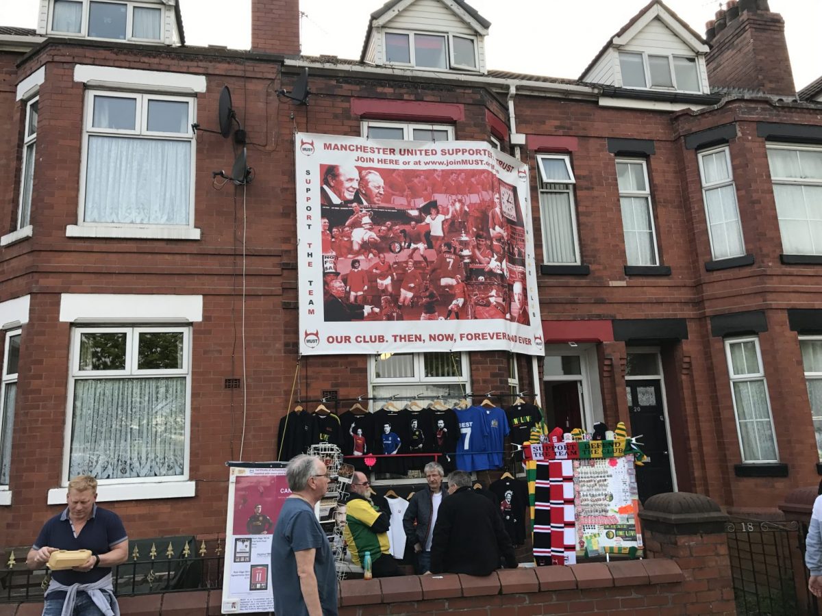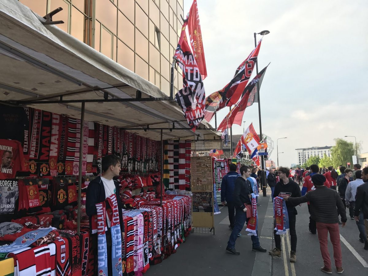 Spätestens bei Erreichen der Kreuzung Warwick Road/Chester Road begann die für England so typische Fußballstimmung. Unzählige -teils „illegale“- Merchandise-Stände mit den so beliebten Spieltags-Schals und noch viel mehr Pins, mobile Fritten- und Hamburger-Buden und natürlich der stadiongebundene Pub für Heimfans. Dazu viele Menschen, die über eine Zugangsstraße zum in der „Ferne“ thronenden Stadion pilgerten.