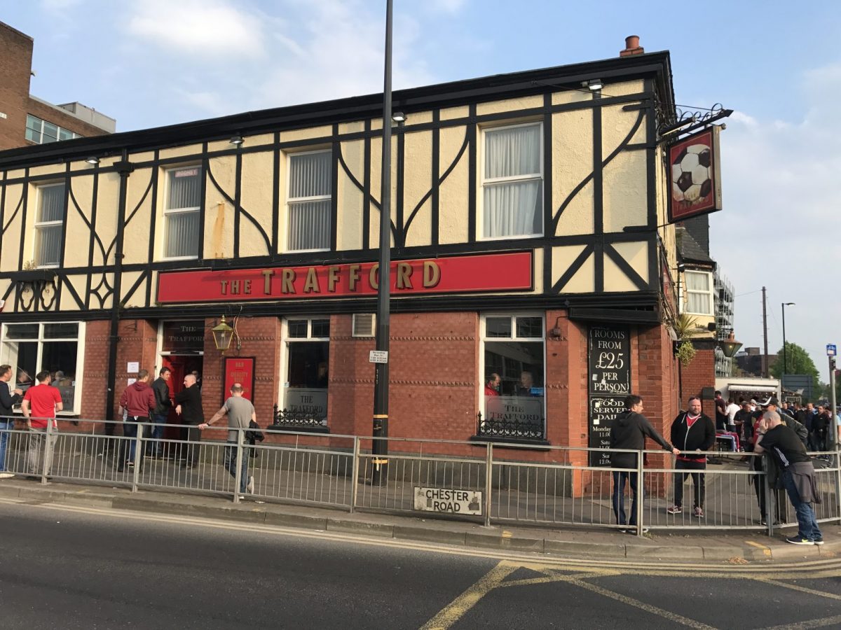 Bei der Gaststätte handelte es sich um den Pub „The Trafford“, direkt auf der Ecke und mit Sicherheit so etwas wie der Treffpunkt der alteingesessenen ManU-Fans. Auch ich war vor ein paar Jahren zufällig mal außerhalb eines Spieltages drin. Trotzdem war der Pub zur Mittagszeit sehr gut besucht, ich hatte nach Betreten aber auch den Eindruck, dass sich dort so ziemlich jeder kennt. Zumindest schauten mich alle Stammbesucher prüfend und äußerst skeptisch an.