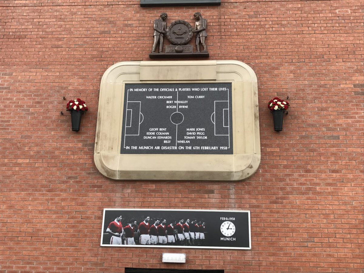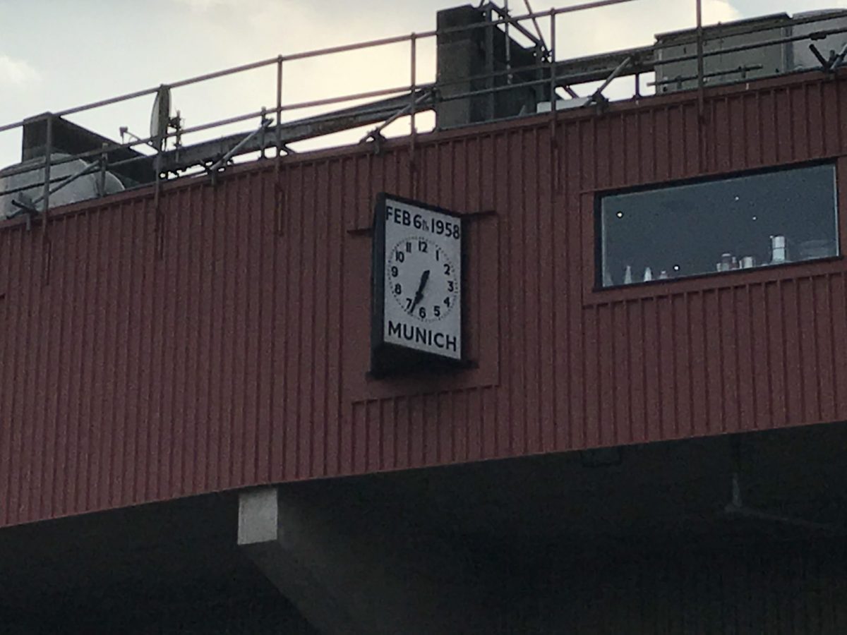 Zurück in die Gegenwart, ich war also endlich da, am Stadion Old Trafford. Das Stadion wird aufgrund der vielen magischen Fußballnächte der Vergangenheit oft auch „Theater der Träume“ genannt. Es war Gastgeber der Fußball-Weltmeisterschaft 1966 sowie der EURO 1996 und fasst insgesamt 75.653 Zuschauer. Obwohl alles ein wenig moderner als in Liverpool wirkte, haben die Verantwortlichen die Vergangenheit nicht vergessen. Davon zeugen eine Gedenk-Uhr (Munich-Clock) und Gedenk-Plakette am „East-Stand“ des Stadions, welche an die Katastrophe und die Busby-Babes eindrucksvoll erinnern!