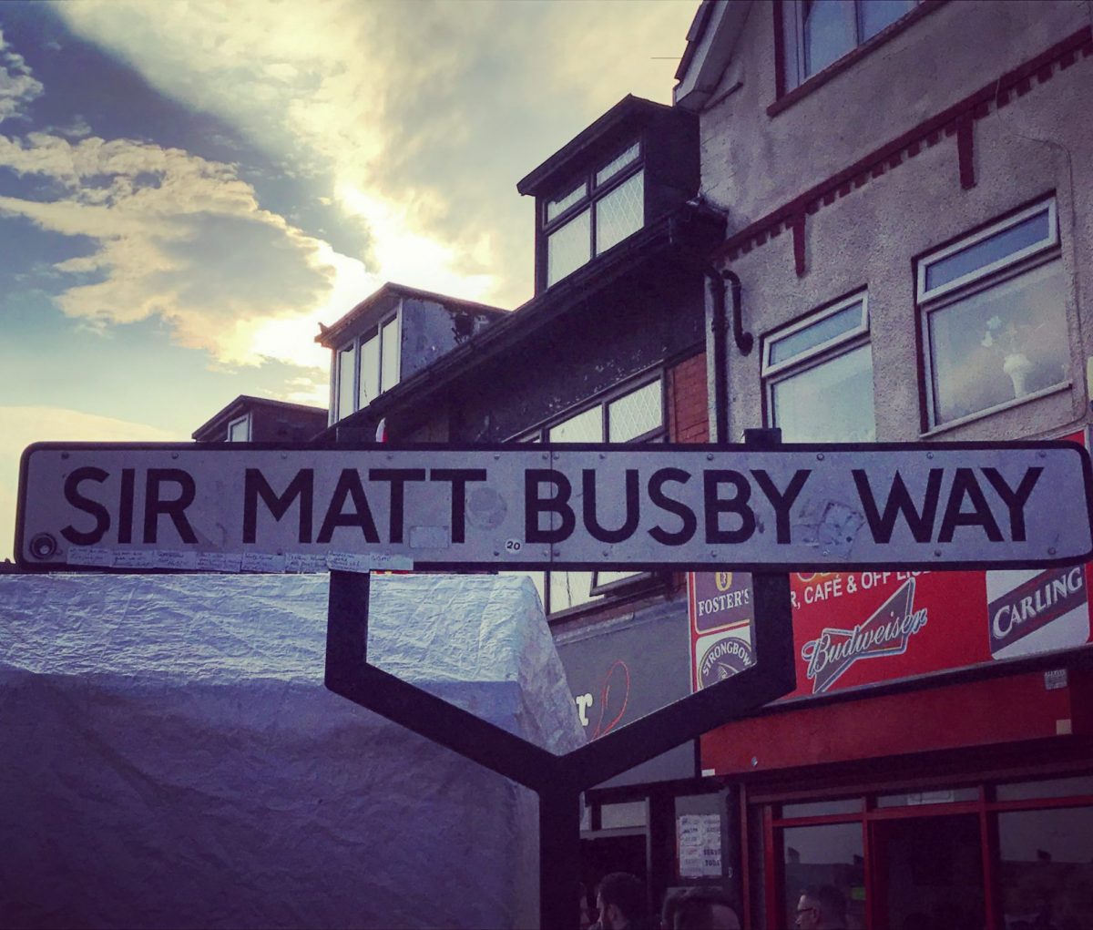 Nach Überqueren der Chester Road gelangt man auf die bereits beschriebene Zugangsstraße, die mit Sicherheit nicht weniger Tradition als die Liverpooler Anfield Road besitzt. Der Sir-Matt-Busby-Way führt direkt auf das Old-Trafford-Stadion zu, an welchem man fußläufig nur knapp 5 Minuten später eintrifft.