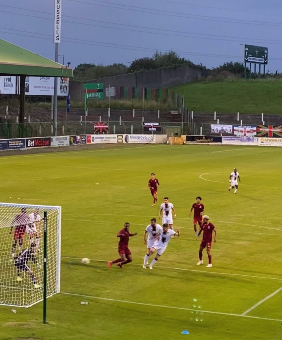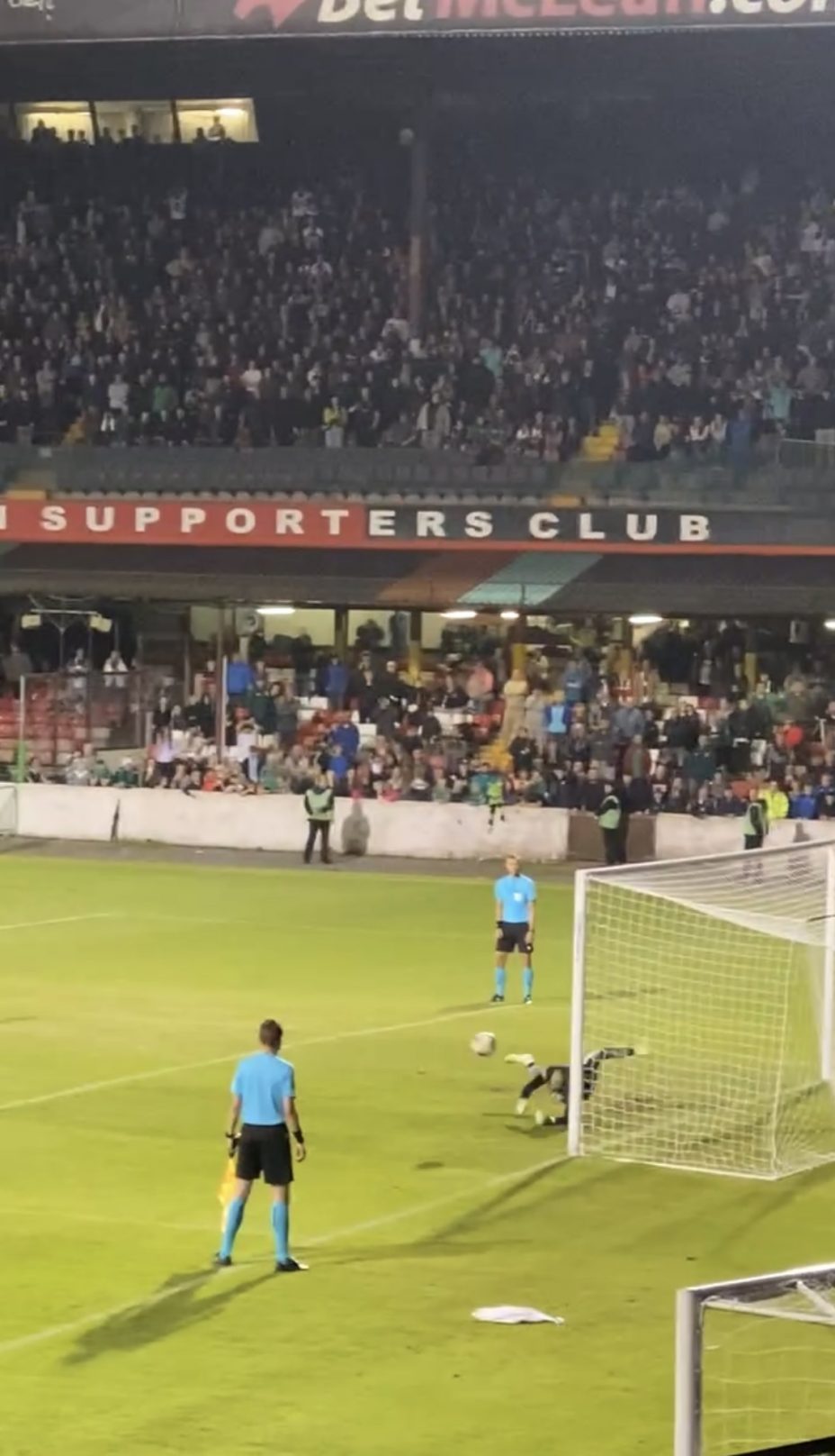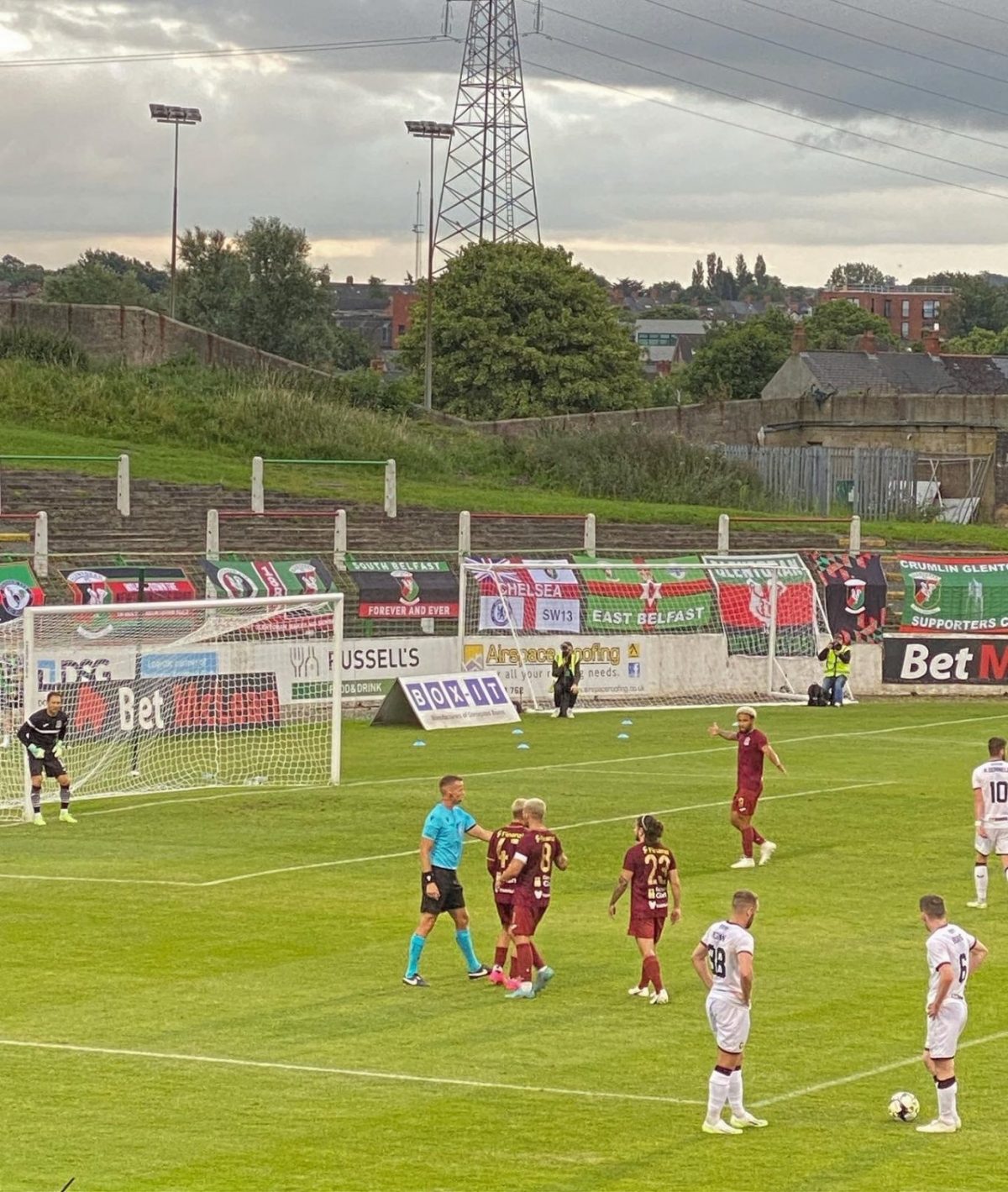 – In der 13. Minute der Nachspielzeit fällt der vielumjubelte Ausgleich für Glentoran dann doch noch, ausgerechnet durch den vorherigen Elfer-Fehlschützen Bobby Burns!