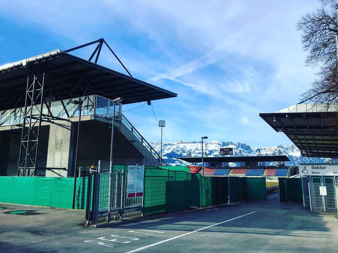 Das Match fand im Rheinpark Stadion Vaduz statt, welches zugleich auch als Nationalstadion dient und dem ein recht großes Trainingszentrum angegliedert ist. Der Ground befindet sich etwas außerhalb des Stadtzentrums, direkt an unserem „Vater Rhein“, welcher zugleich auch als „Grenzfluss“ zwischen der Schweiz und Liechtenstein fungiert. Das wirklich äußerst neuwertige und gepflegte „Schmuckkästchen“ fasst knapp 8.000 Zuschauer und wurde 1998 mit einer 0:8-Freundschaftsspiel-Niederlage des FC Vaduz gegen den damaligen deutschen Spitzenclub 1. FC Kaiserslautern eingeweiht…ja, liebe Kinder…der FCK aus der Pfalz war mal ein richtig guter Verein.