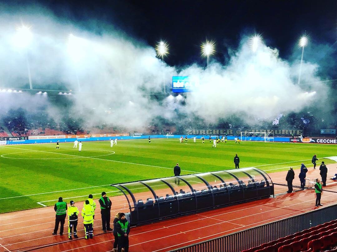 Obwohl der Besuch zahlenmäßig eher enttäuschend war, offerierten die Anhänger des FCZ vor dem Spiel eine sehr schöne Choreografie! Überraschend war hier nur der übermäßige und beidseitige Gebrauch von auch in der Schweiz verbotener Pyrotechnik, welcher während des Spiels andauerte und das Spielfeld fortlaufend in Rauch einhüllte.