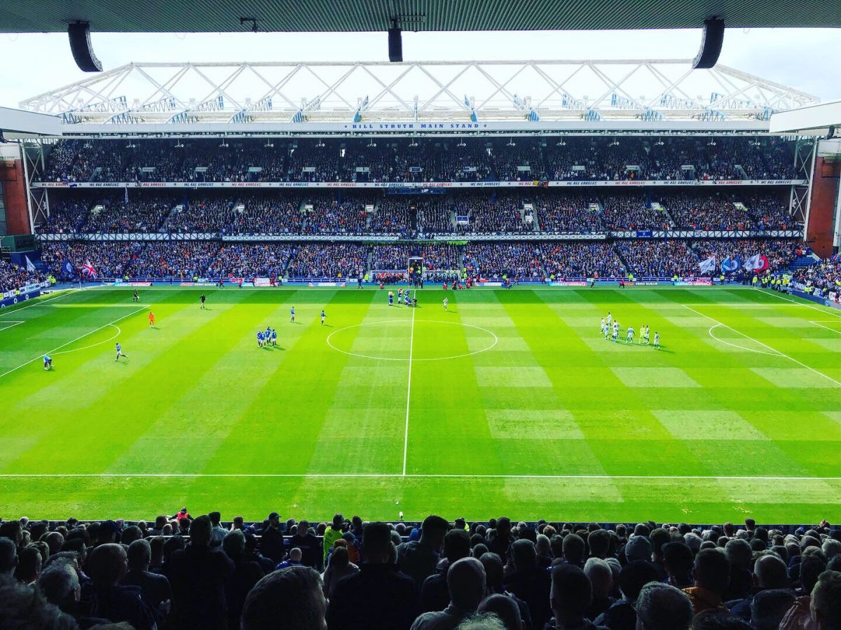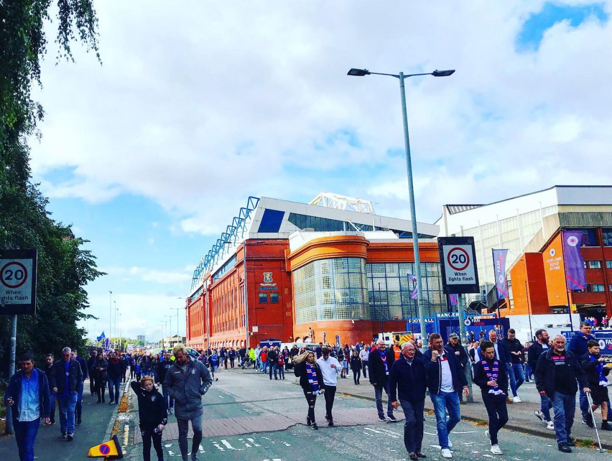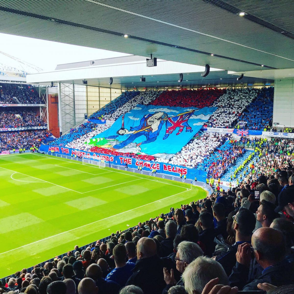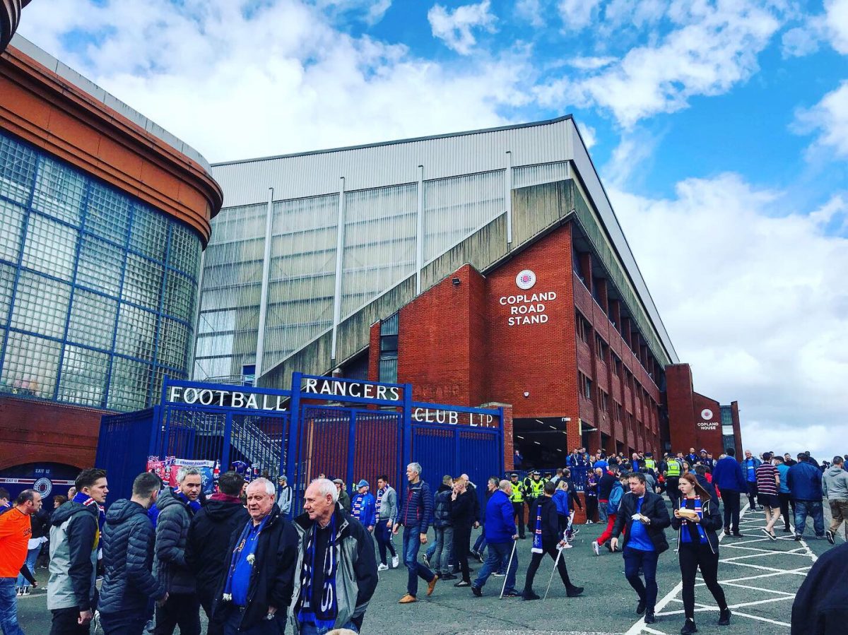 Gegen 11.30 Uhr ging es die 500 Meter rüber zum Ibrox-Stadium…während in Deutschland zu dieser Zeit schon lange die Vorspielphase mit Vereinssong und Aufstellung zelebriert wird, ist man in Schottland eher gemütlich unterwegs…das eigentliche Programm mit den Gassenhauern „Blue Sea of Ibrox“ und Tina Turner‘s „Simply the best“ startet kurz vor Anpfiff bzw. vor Einlauf der Teams!