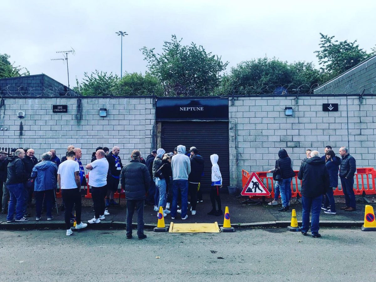 Nach einem kurzen Spaziergang war der Ort der inneren Einkehr erreicht…der lieb gewonnene „Neptune Social Club“, für mich ein besonderer Ort, auch wenn er von Außen nicht so aussieht! Das graue Gebäude mit Flachdach und einem elektrischen Rolltor war um Viertel vor Elf noch geschlossen. Dies hing damit zusammen, dass der gewerbliche Alkoholausschank erst ab 11 Uhr behördlich erlaubt war und vorher keine Gaststätte öffnen durfte! In Verbindung mit der frühen Anstoßzeit kann man alkoholbedingte Ausschreitungen so einfach verhindern!