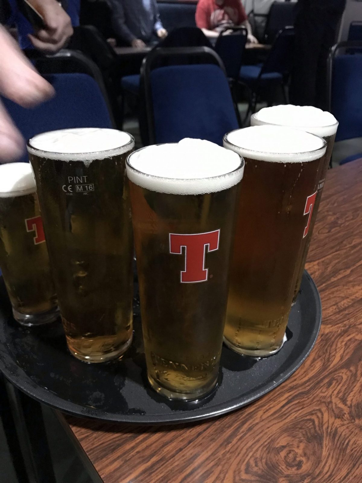 Zumindest in der Theorie…während der 15minütigen Wartezeit vor dem schweren Rolltor wurde in unserer Gruppe bereits das Geld für zwei schnelle Runden im Neptune Club gesammelt! Wohlgemerkt eine knappe Stunde vor Spielbeginn! Mit Öffnung des Clubs ging es rein…Mitgliedsausweis vorzeigen…Sitzplatz suchen…zwei Pints in 20 Minuten…das alles selbstverständlich im absoluten Schnelldurchgang! Da kann die Blase später schon mal nervös werden!