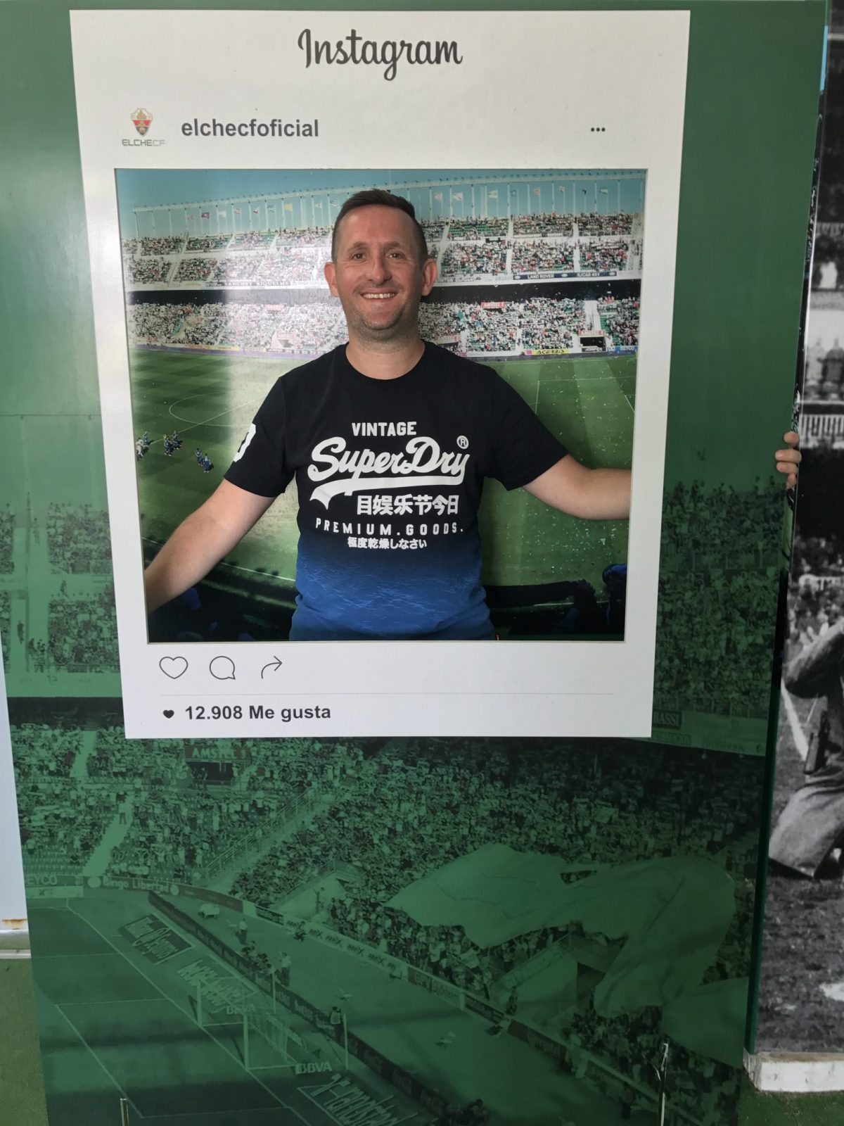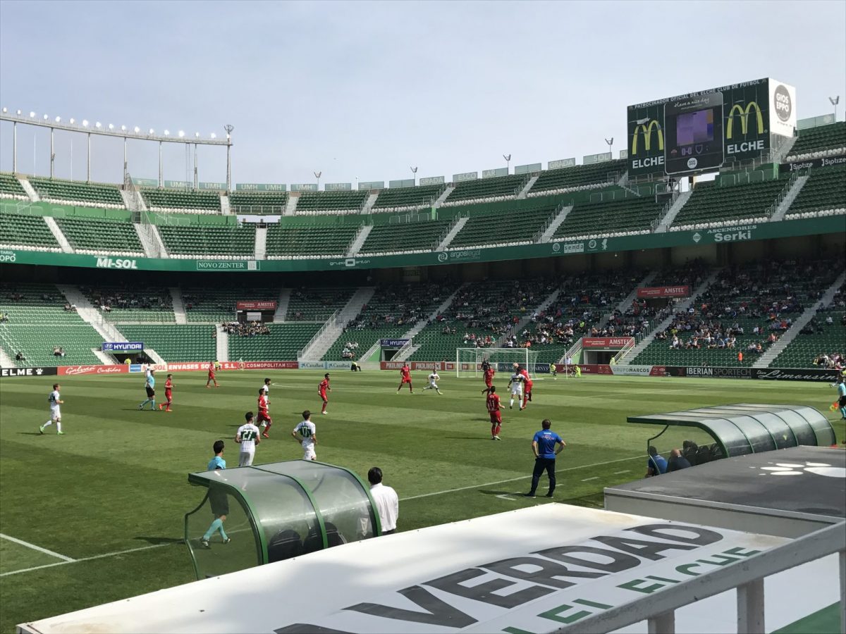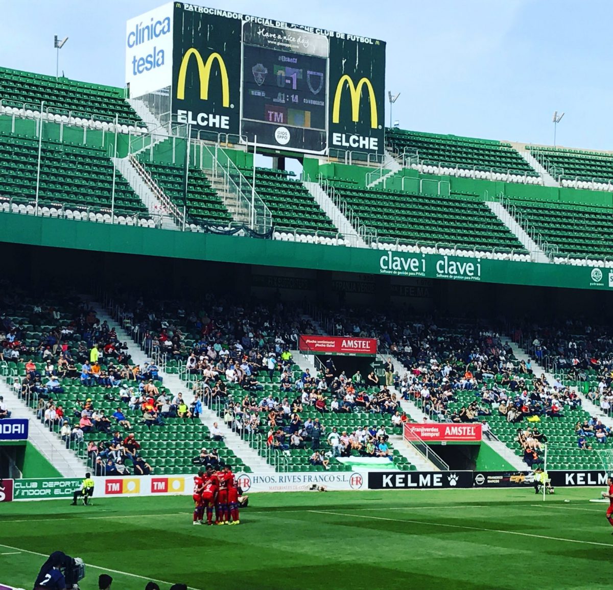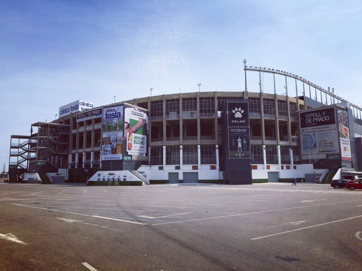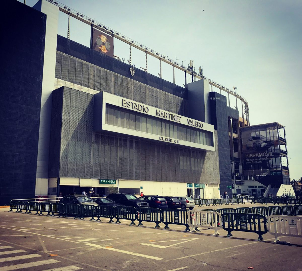 Der Star des hoch verschuldeten Vereines, welcher zum Ende der Saison 2015/2016 nur aufgrund finanzieller Verbindlichkeiten aus der ersten Liga verbannt wurde, ist mit Sicherheit das Stadion. Das Estadio Martinez Valero mit einem Fassungsvermögen von 36.000 Zuschauern ist ein großer grauer Betonklotz aus den 70er-Jahren, welcher für die FIFA Fußball-Weltmeisterschaft 1982 erbaut wurde. In dem Stadion fanden drei Gruppenspiele der Gruppe 3 mit den Mannschaften aus Ungarn, El Salvador und Belgien statt. Der Kracher dürfte damals das Spiel zwischen Ungarn und El Salvador gewesen sein, als die Magyaren das Team aus Mittelamerika mit 10:1 recht torreich abfertigten. Selbst ein spanisches Pokalendspiel fand schon im „Martinez Valero“ statt. In der Saison 2002/2003 gewann der RCD Mallorca durch ein 3:0 gegen Recreativo Huelva die „Copa del Rey“. Gerade weil an dem Stadion augenscheinlich seit zwei Jahrzehnten nichts mehr renoviert oder verbessert wurde, wirkte es von außen irgendwie erschlagend und ein wenig monumental. Das Innere des Stadions zeigte sich mit seinem Unter- und Oberrang allerdings weitaus gepflegter und in einem guten Zustand. Trotzdem wäre es für Deutschland unbrauchbar, es besitzt kein Dach.