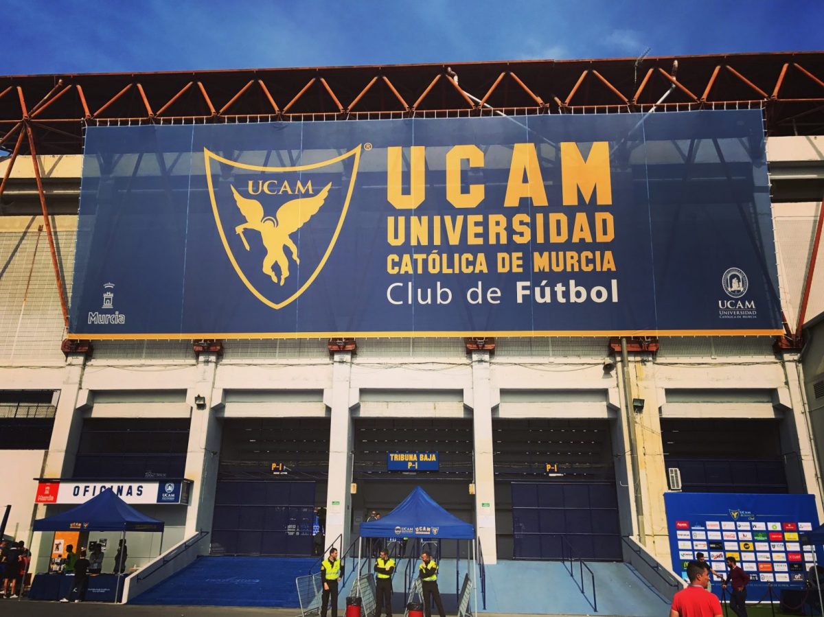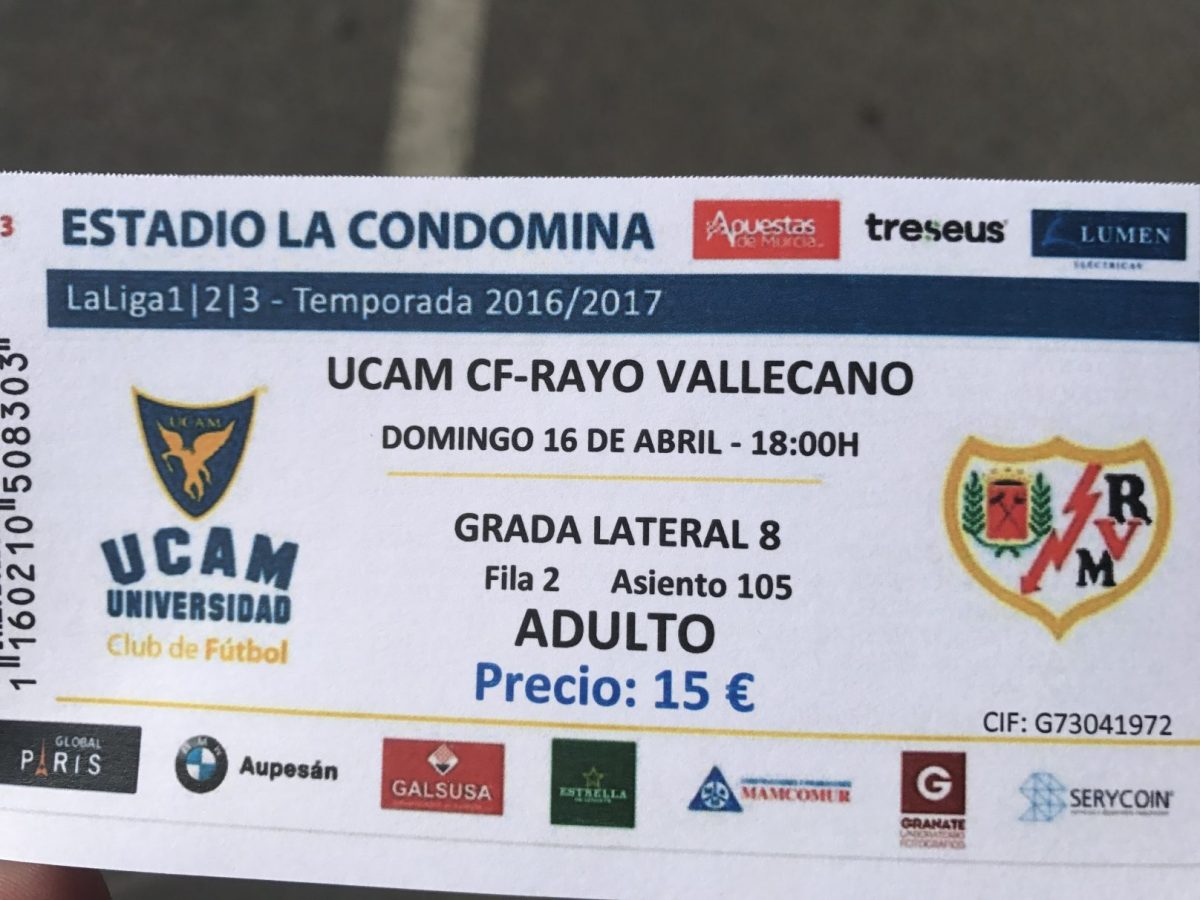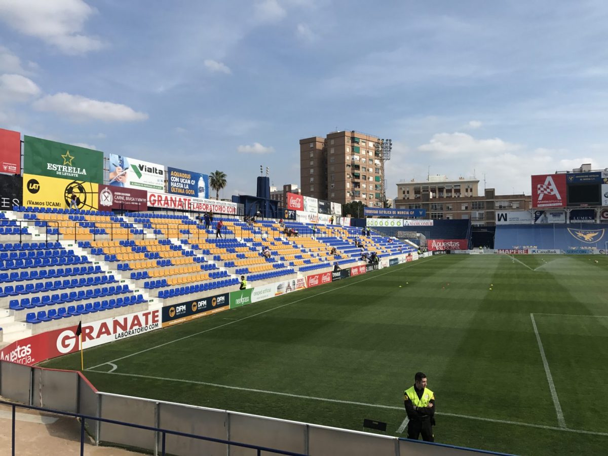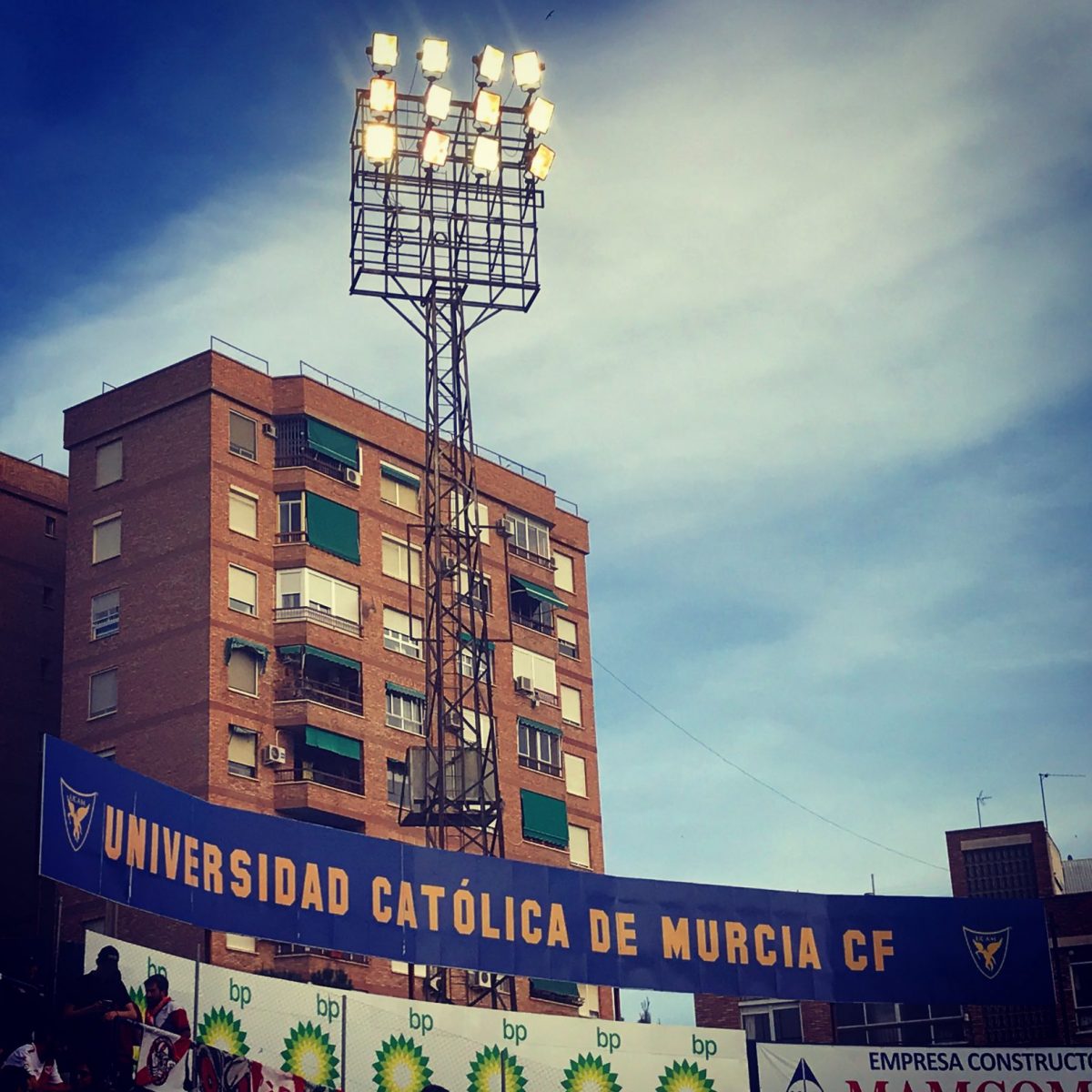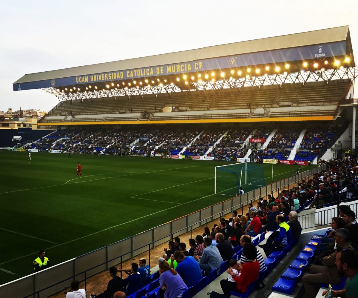 Das Scheitern des „Großen“ ist aber auch immer eine Chance des kleineren Vereines in der Stadt. Das Team von UCAM Murcia CF (Universidad Católica de Murcia Club de Fútbol), ein Studententeam der örtlichen katholischen Universität, wurde erst 1999 gegründet und stieg zur Saison 2015/2016 in die 2. Liga auf. Die Studenten haben einfach das alte Stadion des ehemaligen Stadtrivalen im Stadtzentrum übernommen und spielten zum Zeitpunkt meines Besuches trotz der vorhandenen Abstiegsgefahr eine recht gute Saison. Die Arena „La Condomina“ ist ein klassisches Innenstadtstadion mit all seinen Vor- und Nachteilen. Bedeutete für mich konkret, dass ich arge Probleme hatte, meinen Mietwagen zu parken, aber auch wirklich leckere Tapas in den unzähligen Bars rund ums Stadion genießen durfte. Das Stadion mit einem Fassungsvermögen von 6500 Zuschauern besitzt eine überdachte Haupttribüne, die restlichen Plätze waren mehr oder weniger sonnenüberflutet.