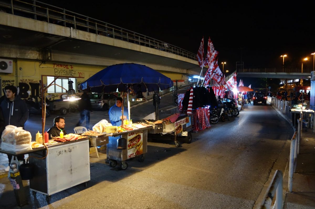 Das Stadion des Olympiacos FC existiert an diesem Ort seit 1895 und wurde erst vor knapp 12 Jahren grundlegend saniert. Nach Abriss und einem nahezu kompletten Neubau fasst es nun 33.296 Zuschauer. Die Arena bietet alle von der UEFA geforderten Einrichtungen und wurde für die olympischen Spiele 2004 in Athen genutzt. Bei Umrundung des Stadions fiel mir auf, dass auch die übrigen Abteilungen des Vereines im Stadion eine Heimat fanden (z.B. die Kampfsportabteilung mit Fitnessbereich). Rund um das Stadion befanden sich die üblichen Straßenköche, welche die griechische Version der Stadionwurst zubereiteten. In Piräus handelte es sich um einen Fleischspieß im Brot. Lecker, aber auch sehr magenfüllend.
